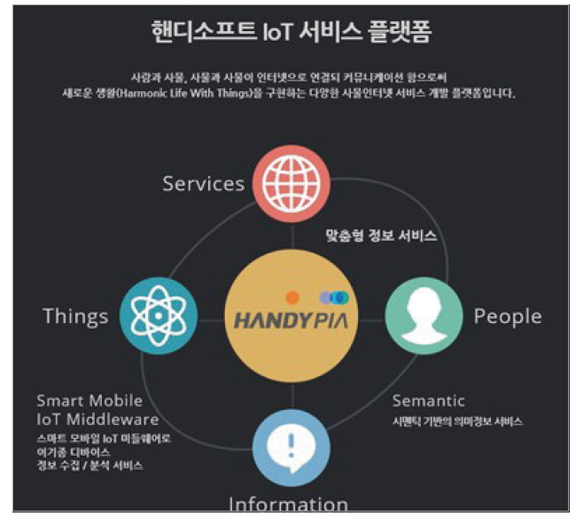 Handypia IoT 플랫폼은 사물의 IoT 연동 및 데이터 처리, 시맨틱 기반의 분석 기능을 제공하는 국제 표준기반의 IoT 플랫폼이다. 이 제품은 ▲국제 표준(ISO/IEC 30128) 기반의 미들웨어 ▲다양한 사물 등록, 사물 관리 및 사물 데이터 처리 인터페이스 제공 ▲시맨틱 웹 기술을 접목한 시맨틱 데이터 처리(변환, 적재) ▲대용량 시맨틱 데이터 레파지토리 기반의 시맨틱 추론 기능 등을 지원한다.