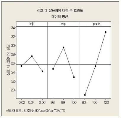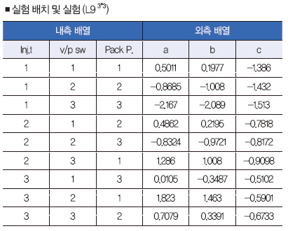 Taguchi 해석에서는 L93*3 배열로 신호 대 잡음비를 계산하며, 현재와 최적 수준과의 S/N비는 개선 후와 개선 전을 비교하면 38.5967-26.2482=12.3485이다. 이것을 손실비로 환산하면 101.23485=17배가 손실을 감소했다. 반면에 특성치 ‘Y’는 -0.8338~-0.8106으로 두께 편차는 0.1894%이다. 다만, 과잉 충진으로 인한 성형품 두께가 0.83%만큼 팽창하고 있어 금형이 열릴 수 있는 문제점이 발견됐다. 형체결력은 173.8ton, 사출압력은 198.1Mpa이다. 기계 최대 형체결력을 사용해야 하는 어려움이 있다.