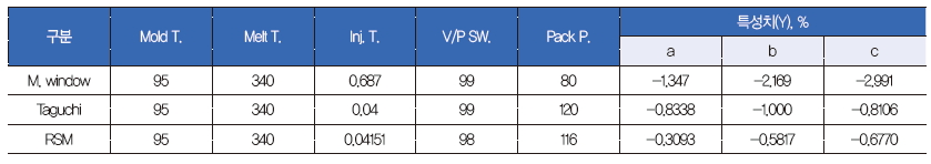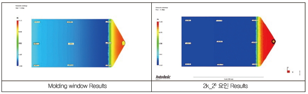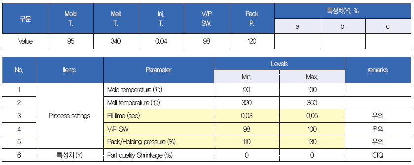 Molding window 해석값을 이용할 경우 특성치 ‘Y’ 는 -1.347~-2.991로 두께 편차는 1.644%이다. 여기서 주의할 점은 성형품 두께가 2.991%만큼 팽창되고 있어 금형이 열릴 수 있는 문제를 가지고 있다. 사출압력 280Mpa, 형체결력 179.5ton으로 최대 사출압력이 사출 성형기의 스펙보다 오버되어 성형이 어려운 조건이다.