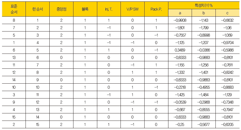 RSM은 설정된 요인들이 특성치 ‘Y’의 반응값에 어떤 영향을 미치는지를 알려주는 매우 유용한 해석 방법이다. 실험 횟수는 15회이며, 특성치 ‘Y’값은 -0.3092~-0.677으로 두께 편차는 0.3677%이다.