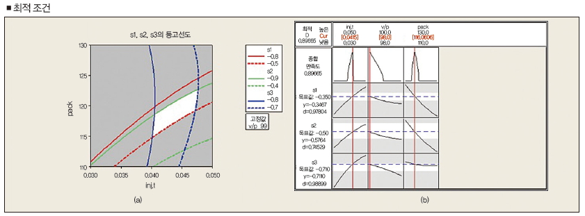 아래 그림은 중첩 등고선도 (a)를 통하여 사출 범위를 확인할수 있고, (b)는 그 값을 계량화하여 정확하게 제시하고 있다. 신뢰도 89% 수준으로 최적값을 활용하면 CTQ(핵심 품질특성)을 얻을 수 있게 된다.