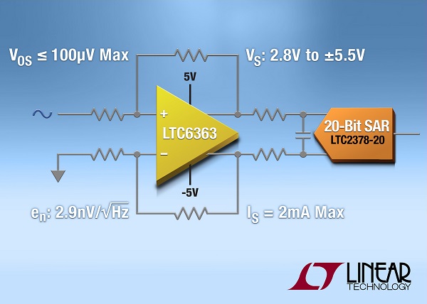 리니어 테크놀로지 코리아는 고성능 16, 18, 20비트 SAR 및 ΔΣ ADC를 구동하기 위해 최적화된 저전력, 고정밀, 완전 차동형 증폭기(제품명, LTC6363)을 출시했다고 발표했다. 100µV 최대 입력 오프셋 전압과 2.9nV/√Hz 입력 리퍼 전압 노이즈를 제공하는 LTC6363은 10V 전원에서 19mW만을 소모한다.