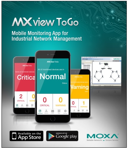 MOXA는 MXview 산업용 네트워크 관리 소프트웨어의 모바일 클라이언트인 MXview ToGo 앱을 출시했다. MXview ToGo 앱은 실시간 이벤트 경고, 실시간 네트워크/기기 상태 확인, 스마트 기기 식별 및 위치를 제공한다. 이 앱은 이동 중에도 바로 업데이트된 네트워크 상태를 확인할 수 있으며, 앱을 다운로드하면 네트워크 모니터링에 모빌리티를 추가할 수 있다.