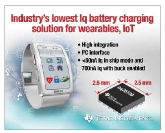 텍사스 인스트루먼트(TI)는 지난달 6일 서울 양재동에서 열린 기자간담회에서 웨어러블, IoT 제품에 사용되는 초소형·저전력 배터리 관리 솔루션을 발표했다. 여기서 TI 코리아 안병남 부장은 “bq25120은 입력전원이 들어오면 이를 다른 회로로 전달하는 파워패스 IC 역할만 지원하므로 별도의 DC-DC 컨버터 및 벅 컨버터를 구성해야 했던 기존 웨어러블용 충전 IC 대비 높은 효율성을 제공한다”고 말했다.