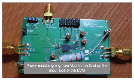 EVM에서 LDO를 테스트하기 위해서는 전자 부하 대신 저항식 부하를 사용해 부하의 잡음 기여를 최소화해야 한다는 점을 명심하자. 이 부하 저항기를 최대한 입력 전원 공급 장치의 음 터미널에 가깝게 접지시켜야 그라운드 영역의 과도한 잡음 발생을 막을 수 있다. EVM의 비교적 작은 그라운드 영역의 큰 그라운드 전류가 잡음 측정에 영향을 줄 수 있다. 이 부분은 그림 5의 예시를 참고한다.