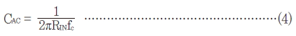 스펙트럼 애널라이저의 임피던스는 고정값(대체로 50Ω)이기 때문에 AC 커플링 커패시터의 커패시턴스에 의해 얼마나 낮은 주파수를 정확하게 측정할 수 있는지가 결정된다. 아래 식 4는 AC 커플링 커패시터의 커패시턴스를 계산하는데 이용할 수 있다.