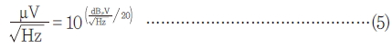 측정된 데이터 포인트 모두에 적용한 후, 주파수 대비 데이터를 그래프로 그려 많은 LDO 데이터시트에서 볼 수 있는 스펙트럼 잡음 밀도의 도면을 제작할 수 있다. 식 5은 dBµV/√Hz에서 µV/√Hz로 변환하는 방법을 나타낸다.