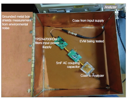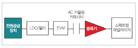 LDO나 그 전의 필터는 옵션으로서, 전원 공급 장치에서 나오는 잡음을 감소시키며 AC 커플링 커패시터는 AC 신호가 다음 회로에 전달될 수 있게 해준다. 이외에 증폭기 역시 옵션으로 스펙트럼 애널라이저가 신호를 더 쉽게 측정할 수 있게 해준다. 증폭기는 잡음 플로어(EVM 연결 없이 측정된 잡음)가 LDO의 잡음 출력에 비해 너무 높을 경우에만 필요하다.