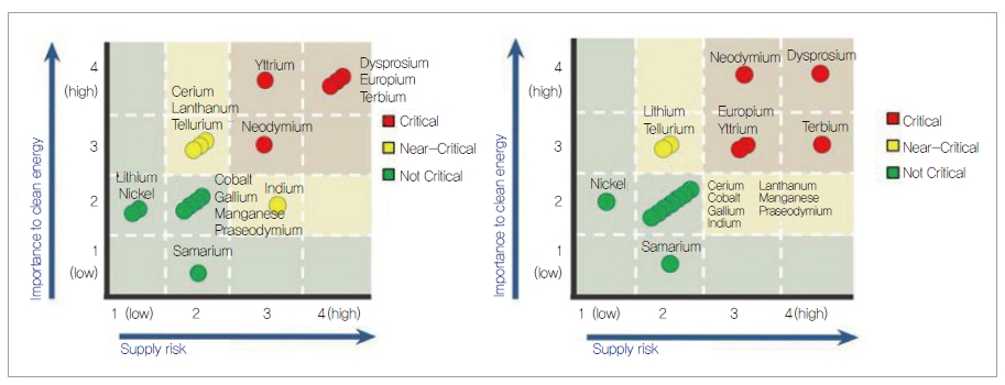 미국 에너지성(DOE)은 Yttrium(Y), Europium(Eu), Neodymium(Nd), Terbium(Tb), Dysprosium(Dy)을 가장 중요한 단기 및 중기 Critical 물질로 분류하고 있다. 이러한 물질들은 중장기적으로 수요에 대한 공급 방안 확보가 어려운 물질로, 전 세계적으로 새로운 공급원 확보를 위한 노력이 필요한 상황이다.