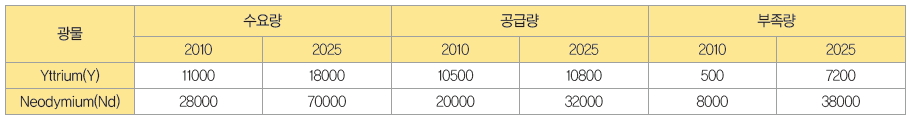 특히 전 세계 희토류 금속 공급량의 약 50%를 차지하고 있는 중국이 2010년부터 수출쿼터제를 적용해 자원 무기화를 시작함에 따라, 2025년경에는 Yttrium 및 Neodymium의 공급량이 절대적으로 부족할 것으로 예상된다.