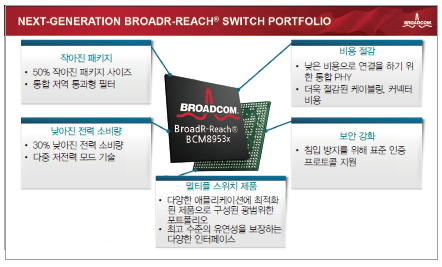 브로드컴의 새로운 제품군인 BCM8953x은 후방 카메라, 계측, 오디오와 비디오 스트리밍 같은 과거 독립적이었던 연결을 모으는 중앙화된 스위치를 만들어 다양한 애플리케이션들간의 데이터를 공유하게 함으로써 소비자 경험을 높여주는 것이 특징이다.