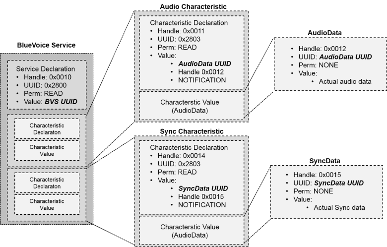 BlueVoice의 경우에는 Audio와 Sync 특성 둘 다 각기 실제 오디오 데이터와 부가 정보인 동기화 값을 담고 있는 128비트 proprietary UUID(AudioData와 SyncData UUID)로 정의된 단일 어트리뷰트를 포함한다.