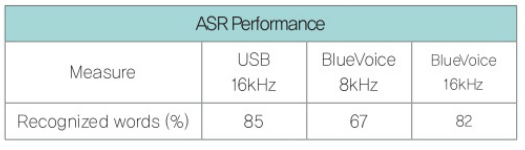 BlueVoice가 전력 소모, 프로세싱 요구량, 메모리 풋프린트 측면에서 적당하다고 해서 리시버 측 음성 신호의 품질을 보장하는 것은 아니다. 그러므로 웹 기반 ASR 서비스를 활용해서 집중적인 전송 테스트를 실시함으로써 리시버 측 ASR 성능을 측정해야 한다. 16kHz USB 마이크(준거용)와 8kHz 및 16kHz BlueVoice 시스템을 사용해서 잘 알려진 영어 단어가 포함된 오디오 샘플 몇 개를 녹음하고 ASR 엔진으로 전달하였다. 표 3은 솔루션 별 단어 인식율을 비교한 테스트 결과이다.