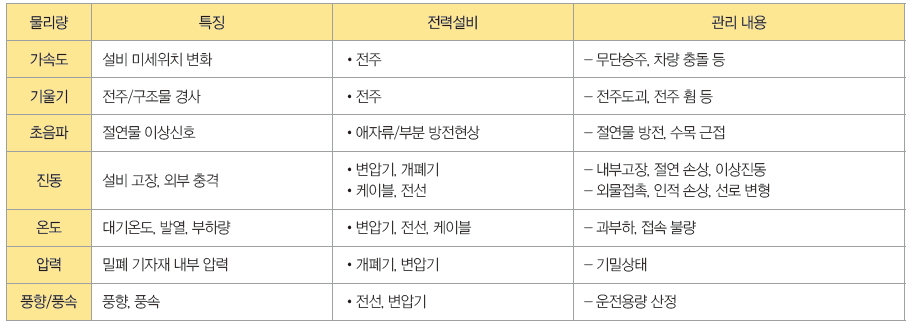 표 1. 센서의 검출 물리량과 전력설비 관리 내용 비교