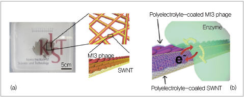 이현정 박사팀은 고전도성 나노전자소재인 단겹탄소나노튜브와 강한 결합력을 가진 실 모양의 바이오 물질을 이용해(M13 박테리오파지) 단겹탄소나노튜브를 나노그물 구조의 대면적 전도성 나노메시 전극으로 형성하고, 고분자 전해질 층을 이용해 효소를 나노메시 전극과 결합시켜 전자 전달 효율이 높은 나노메시 효소전극을 개발했다.