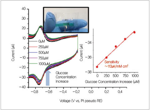 비례하는 것을 이용해 글루코스센서를 구현할 수 있다. 나노메시 효소 전극 기반 글루코스센서는 유연할 뿐