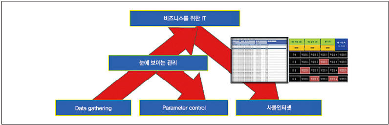 어찌 보면, 사물인터넷 등을 추구하는 스마트공장은 자동화 기술의 최고점이다. 이것은 결코 어려운 것이 아니다. 자동화 설비들을 설치하고 실적을 눈에 보이게 관리하고 그것을 신규 수주와 연동시키어 유연하게 생산 계획을 잡고 추가적 자재를 발주하고 납기를 당기고 신뢰를 확보하여 추가 수주와 신규 고객을 확보하고 가동률을 극대화하고 다시 재투자하는 기업으로서 당연한 선순환 고리를 구축하자는 것이다.