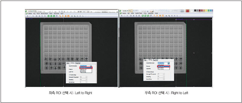 그리고 각 툴들에 대한 선택의 폭은 최대한 보장하여 사용자들의 선택 폭을 최대한 늘리면서도 그 옵션 기능들에 대한 권장 값들은 자동으로 설정되도록 하여 편의성을 극대화했다. 예를 들어 “Find Line” 기능을 사용한다고 했을 때, 사용자는 Line을 찾는 방향에 대해서 4가지 옵션을 선택할 수 있다. 하지만 Image와 ROI 형태에 따라서 권장 설정값을 자동으로 지정해 주도록 하여 초보 사용자도 쉽게 사용할 수 있고 고급 사용자에게는 편리함을 제공하도록 했다. 그림 3은 “Find Line” 사용 시 좌측 ROI와 우측 ROI 지정 시에 방향성에 대해서 권장 값이 자동으로 설정된 부분을 보여주고 있다.