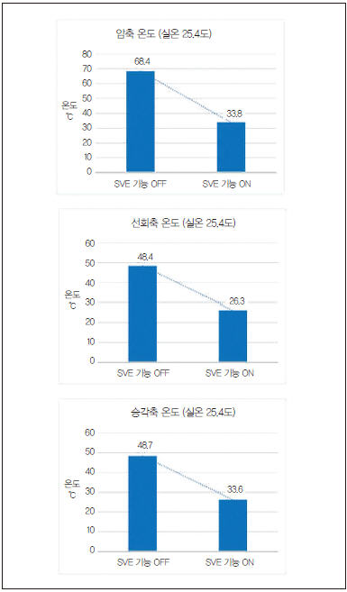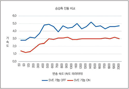 ▲ 표 3. 서보 에뮬레이션(SVE) ON, OFF 시 척에서 측정한 가속도 특성