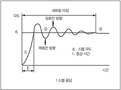 스테핑 모터는 연속적인 스텝 움직임으로 회전하고 있다. 그 스텝상의 움직임 하나를 본 것이 표 2의 1스텝 응답이다.