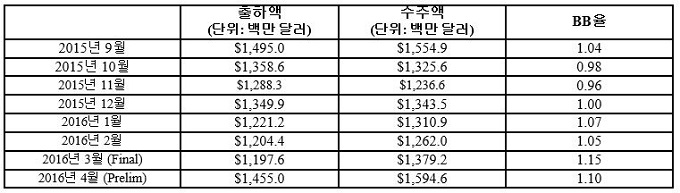 국제반도체장비재료협회(SEMI)가 발표한 4월 BB율 보고서에 따르면, 북미반도체장비업체들의 2016년 4월 순수주액(3개월 평균값)은 15억 9천만 달러이며, BB율은 1.10로 나타났다. BB율은 수주액을 출하액으로 나눈 값으로, BB율이 1.10라는 것은 출하액 100달러 당 수주액이 110달러라는 의미다.