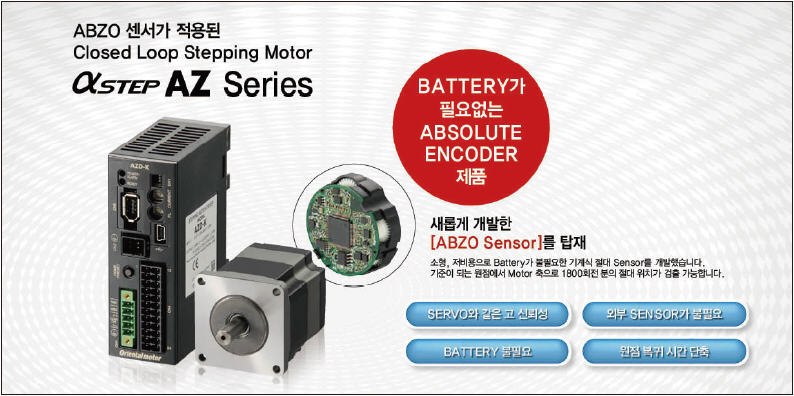 고정도 위치결정 운전에 사용되고 있는 스테핑 모터(STEPPING MOTOR)는 높은 정확성과 신뢰성이 요구된다. 고정도를 요구하는 시스템은 일반적으로 배터리 백업시스템, 폐(閉) 루프 제어 등을 실시한다. 그러나 배터리 교체와 유지보수 등의 단점이 있기 때문에, 이러한 불편을 해소하기 위해서는 배터리가 필요 없고 멀티 턴이 가능하며 반영구적인 절대치 인코더가 필요하다. 오리엔탈모터는 이러한 시장의 요구에 대응하기 위해 ‘ABZO 센서’라는 무전원 배터리, 멀티 턴 Absolute 인코더를 개발했다. 이러한 제품을 기반으로 폐(閉) 루프 스테핑 모터 시스템을 갖춘 ‘AZ 시리즈’가 자동화 시장에 새롭게 등장했다.