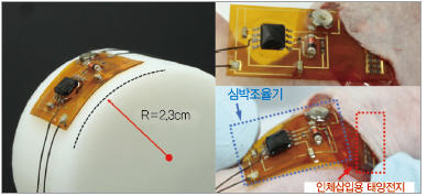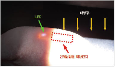 박막 구조의 유연 태양전지(부러지거나 휠 수 있는 성질을 띠면서 빛 에너지를 전기에너지로 바꾸는 장치)를 피부 안에 넣어 심박조율기(심장 박동수를 일정하게 유지하기 위한 대표적인 인체삽입 의료 전자기기)와 같은 인체 내 의료기기에 지속적으로 전력을 공급하는 인체삽입용 태양전지가 개발됐다.