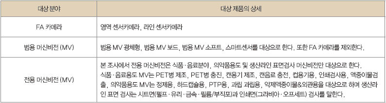 사람이 제품 손상 여부, 정확한 라벨 부착 여부 등을 육안으로 직접 검사하는 대신, 화상처리 기능을 이용하여 검사하는 것이며 FA 카메라, 화상처리 소프트웨어, PC 등으로 구성되어 있다. 머신비전은 크게 범용 머신비전과 전용 머신비전으로 구분되는데, 이 중 야노경제연구소 조사에서의 전용 머신비전은 식품·음료 분야, 의약품용 및 생산라인 표면검사 머신비전만 대상으로 한다.