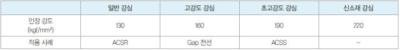 ▲ 표 1. 가공전선 강심의 종류와 인장 강도