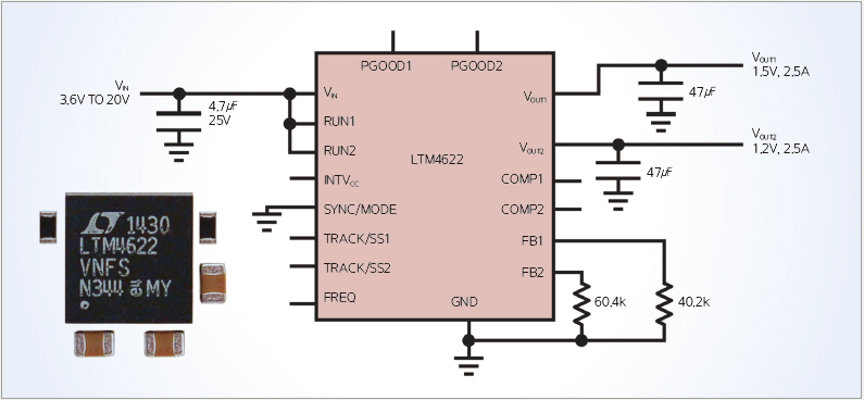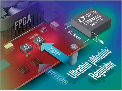 리니어 테크놀로지(Linear Technology)의 LTM4622는 듀얼 2.5A 또는 전류 공유로 이들 출력을 연결하는 단일 5A의 스텝다운 μModule?(파워 모듈) 레귤레이터로서, 6.25mm×6.25mm×1.82mm 초박형 LGA 패키지로 구성돼 있다. 이것은 솔더링한 0805 사이즈 커패시터와 같은 높이이며, 높이가 극히 낮아 PCB 하단에 탑재할 수 있기 때문에 상단면에 디지털 IC를 탑재할 수 있다.