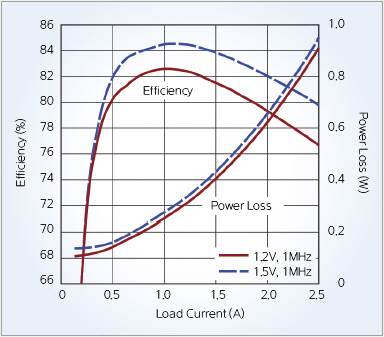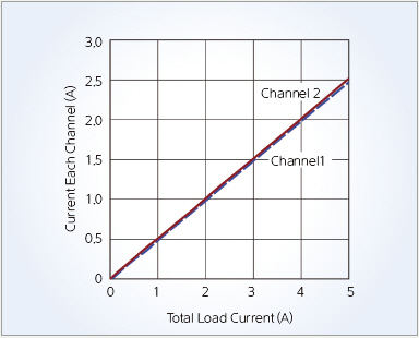 콤팩트한 멀티 레일 솔루션으로 2개의 전압을 레귤레이트할 수 있으며, 각 출력으로 최대 2.5A(3A 피크)를 공급할 수 있고 라인, 부하, 온도에 대해 1.5%의 최대 총 DC 출력 전압 오차, 0.6V∼5.5V로 정확하게 레귤레이트할 수 있다. 또한 전류 공유로 이들 출력을 연결할 경우 최대 5A에 이르는 출력 전류를 공급할 수 있다.