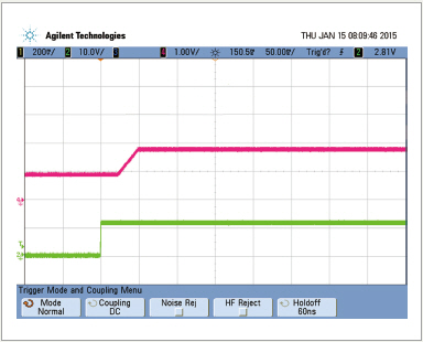 그림 4, 그림 5는 그림 2의 회로로 1.5V 출력 레일의 빠른 트랜션트 응답과 사전 바이어스 스타트업 성능을 나타낸 것이다.