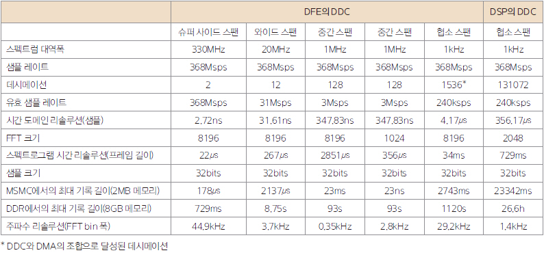 • DFE의 DDUC 블록은 캡처된 샘플의 다운 변환과 데시메이션을 지원한다(I/Q 페어). 데시메이션은 샘플링 레이트를 사용자가 요구하는 주파수 범위에 맞추는 데 사용된다.
