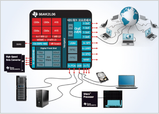 TI의 KeyStoneⅡ 아키텍처를 기반으로 하는 66AK2L06 SoC는 확장 가능한 저전력 솔루션으로, 통합 FFT 하드웨어 가속과 DFE, 고속 JESD204B 인터페이스, 네트워크 코프로세서, 통합 GBE 스위치 등의 프로세싱 시스템을 갖추고 있다.