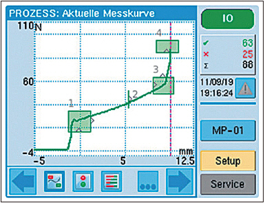 프레스 연결의 경우, 오직 파괴 테스트 절차를 통한 후에 접합부의 확인이 가능하다. 손상 제품을 방지하기 위해, 조립 프로세스의 각 단계를 maXYmos BL로 감시하며 모든 품질 요건 및 기록 요건이 충족되었는지 확인해야 한다. 값 테이블에는 프로세스 값과 해당 평가 요소들의 관련 목표 범위가 나와 있다.