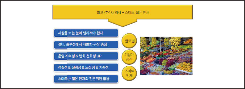 그리고 차후 또 다루겠지만, 최고경영자의 의지와 스마트한 인재를 알아보고 발굴하고 키우고 존중함으로써 경영자의 부담을 덜고 도전에 대한 위험을 줄일 수 있다. 스마트 인재는 존중하지 않으면 바로 떠나게 되어 있다. 스마트 인재에게 충성심을 기대하는 것은 착오이다. 단 하루를 같이 공유하며 있더라도 그들을 존중하면 반드시 좋은 결과를 주는 특성이 있다.