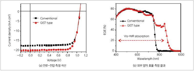 ▲ 기존 페로브스카이트 태양전지(흑색)와 신규 하이브리드 태양전지(적색)의 전류-전압 측정 곡선 및 외부 양자 효율(External Quantum Efficiency)