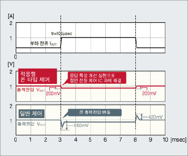 이러한 적응형 온 타임 제어를 통해 일반 제어 방식에 비해 65% 이하인 출력전압 변동 200mV(부하 전류 1A, 턴온 100㎲일 때)를 실현해, 순간적인 부하 전류 변동에 대해 부하 응답 특성을 개선함으로써 신뢰성 향상에 기여한다.