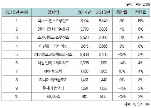 IC 인사이트가 발표한 2015년 글로벌 아날로그 IC 공급업체 순위를 보면, ADI는 4위, 리니어 테크놀로지는 8위에 각각 위치해 있다. ADI가 리니어를 품으면서 단숨에 인피니언을 제치고 텍사스 인스트루먼트에 이어 2위에 올랐다. 점유율로는 2015년 기준 전체 아날로그 IC 시장의 9%를 차지하게 됐다. 회사 관계자는 “인수 절차가 마무리되면 아나로그디바이스는 예상 연간 실적 약 50억 달러의 세계 최고 아날로그 기술 기업이 될 것”이라고 말했다.
