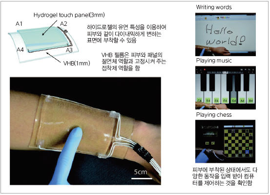 하이드로젤을 이용한 터치패널은 쉽게 변형할 수 있으므로 어떤 형태를 가진 표면이든 부착 가능하다. 따라서 기존의 웨어러블 기기를 넘어 인체 피부에 부착되는 형태로도 사용할 수 있다. 이번 연구에서는 하이드로젤 터치패널을 사람의 팔에 부착했고, 이를 이용해 글씨를 쓰고 음악을 연주하며 게임을 하는 등의 다양한 동작이 가능하다는 것을 확인할 수 있었다.