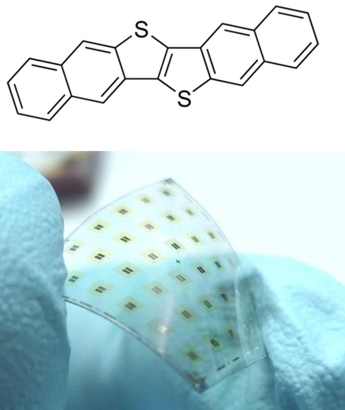 ▲ 전하 수송층에 사용된 유기 반도체 DNTT 의 구조(위)와 제작된 플라스틱 시냅스터(아래). 윤명한 GIST 교수팀은 극초박막 나노시트를 활용해 전하 이동도가 기존보다 10배 향상된 플렉시블 시냅스 트랜지스터(일명 시냅스터) 소자를 세계 최초로 개발했다.(지스트 제공) 2016.9.21© News1