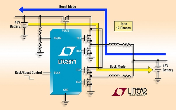 리니어에 따르면, LTC3871은 12V와 48V 간의 양방향 DC/DC 제어 및 배터리 충전 기능을 제공한다. 신제품은 48V 버스에서 12V 버스로는 벅 모드로, 12V에서 48V로는 부스트 모드로 동작한다. 각각의 모드는 적용되는 제어 신호에 따라 온디맨드 방식으로 설정된다.