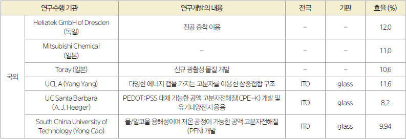 미국의 산타바바라 소재 캘리포니아 주립대(UCSB), 로스앤젤레스 소재 캘리포니아 주립대(UCLA), 프린스턴, Wake Forest, 홍콩 과학대학 등에서 고효율 유기태양전지를 발표하였고 최대 10.8%의 에너지 변환 효율을 발표했다. 국외 연구기관의 유기태양전지 소자 기술 현황은 표 1과 같다.