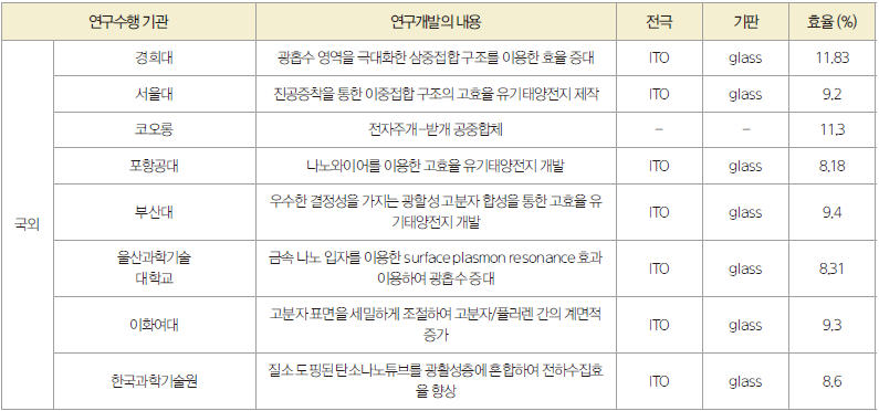 국내의 연구 수준은 해외의 우수 결과들을 재현하는 수준으로 플라스틱 태양전지에 대한 체 계적인 연구가 절실하다. 고효율 유기 태양전지 분야에서 연구단이 세계최고 수준의 결과를 발표하였지만 기술의 산업화와 관련된 핵심 인프라는 국내에 구축되어 있지 못한 상황이다. 소자프린팅 기법과 관련된 기술은 학교나 연구소 등 실험실 규모에서 시도되고 있으나, 이에 대한 전략적인 접근은 이루어지지 못하고 있다. 최근 유기 태양전지 상업화 시도와 같은 세계적인 흐름을 고려해보면, 유기 태양전지의 양산기술 확보 및 제반 기술에 대한 확보가 절실하다. 국내 연구기관의 유기태양전지 소자 기술 현황은 아래 표 2와 같다.