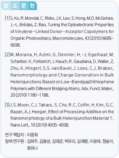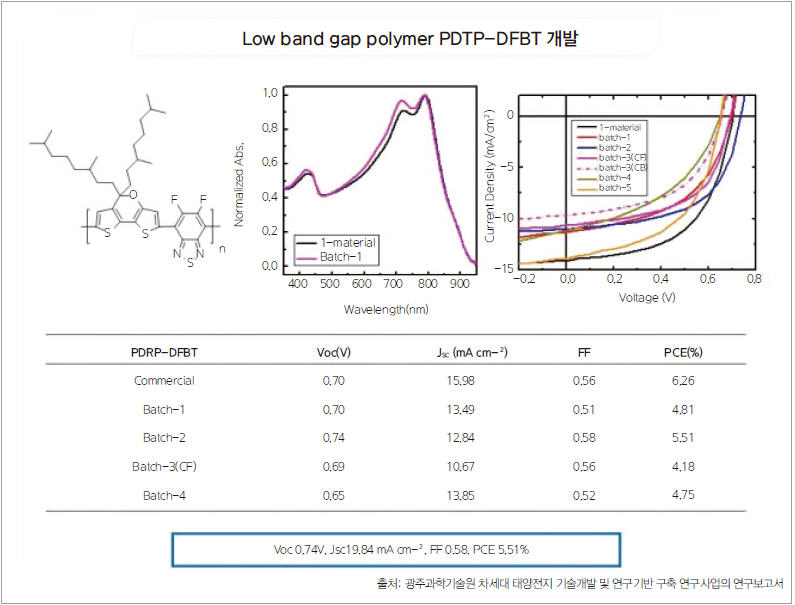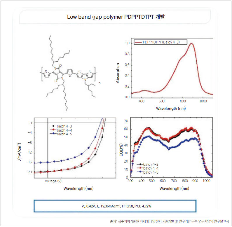 최근 높은 효율을 얻고 있는 PTB7-th의 경우 Yong Cao 그룹에서 10.6 %의 효율을 Nature Photonics에 보고하여 그 우수성을 널리 인정받고 있다. 그 외 낮은 밴드갭 물질인 PDTP-DFBT 및 PDPPTDTPT의 경우 연구진에서 재현에 성공하여 다양한 유기 태양전지 연구에 활용하고 있다.