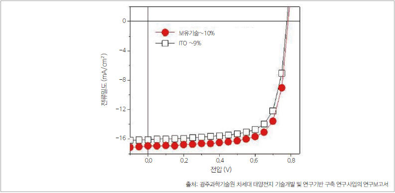 ▲ 그림 12. 유기 무기 하이브리드형 전극을 이용한 10% 효율의 유기태양전지 전류-전압 곡선