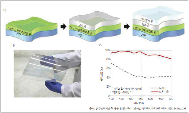 형성된 금속박막 위에 전도성 고분자 용액 기반의 반사방지 층 도입하여, 우수한 광학적, 전기적 특성(광 투과율 95% 이상, 면저항 10 Ω/이하), 기계적 유연성을 만족하는 고사양의 플렉시블 투명전극을 개발했다. 전극기술을 유기태양전지에 적용하여 10%의 에너지 전환효율을 갖는 유기태양전지 단일층 소자를 개발했다.
