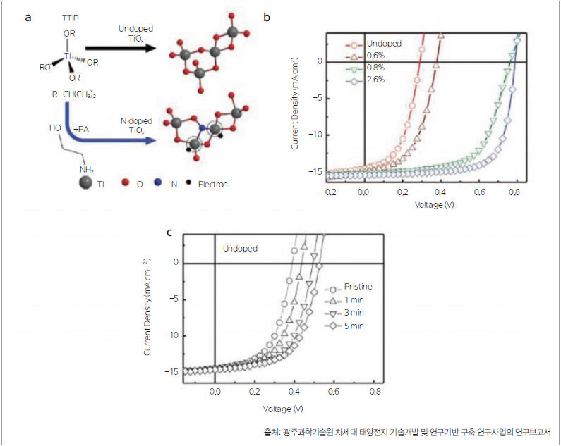 타이타늄 산화물(TiOx)은 자체적으로 소자 내의 수분과 산소를 제거하는 능력을 가지고 있어 전자 전달층 역할과 동시에 봉지 소재로 각광 받고 있지만, 금속 산화물의 낮은 전하 밀도로 인하여 유태양전지의 기능층으로 사용시 Light-Soaking 문제에 따는 성능저하 문제가 발생했다.