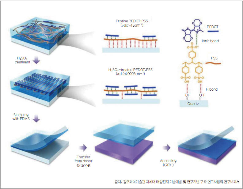 연구진은 PEDOT에 H2SO4처리를 하여 우수한 전도도 (σdc > 4000 S cm-1)의 적층소자에 적합한 투명한 고분자 전극을 개발한다.