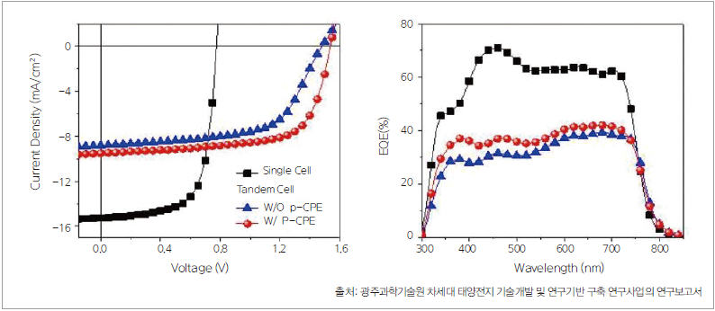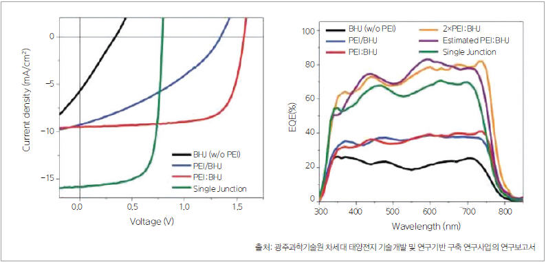 ▲ 그림 7. P-type 기능층과 광활성 물질을 포함한 혼합잉크로 제작된 이중 접합 소자의 J-V 특성 및 외부양자효율(EQE) 측정 결과